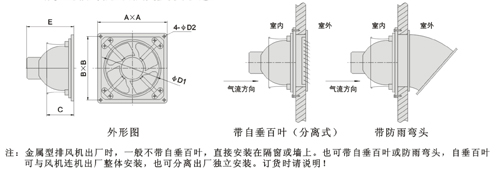| 注:金属型排风机出厂时,一般不带自百叶,直接安装在隔窗或墙上。也可带自垂百叶或防雨弯头,自垂百叶可与风机连机出厂整体安装,也可分离出厂独立安装。订货时请说明! |
